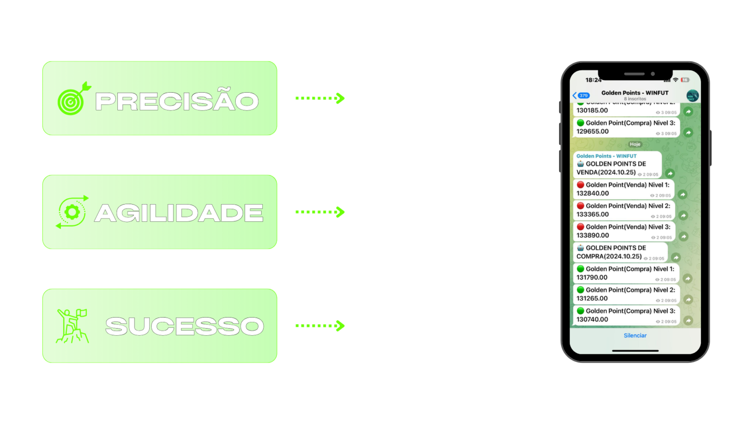 As análises são enviadas diretamente no Telegram, todos os dias úteis às 09:05 da manhã, antes da abertura do mercado. Você receberá um panorama claro, com 3 regiões de compra e 3 regiões de venda para Índice, Dólar e Bitcoin.